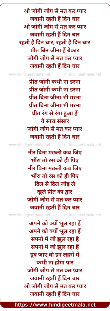 Lyrics of O Jogi Jog Se Mat Kar Pyar - ओ जोगी जोग से मत कर प्यार
