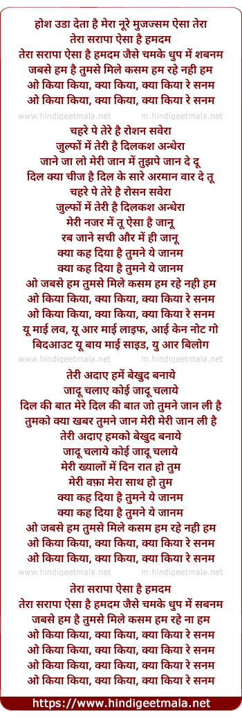 Lyrics of O Kiya Kiya, Kya Kiya, Kya Kiya Re Sanam - ओ किया किया, क्या किया, क्या किया रे सनम