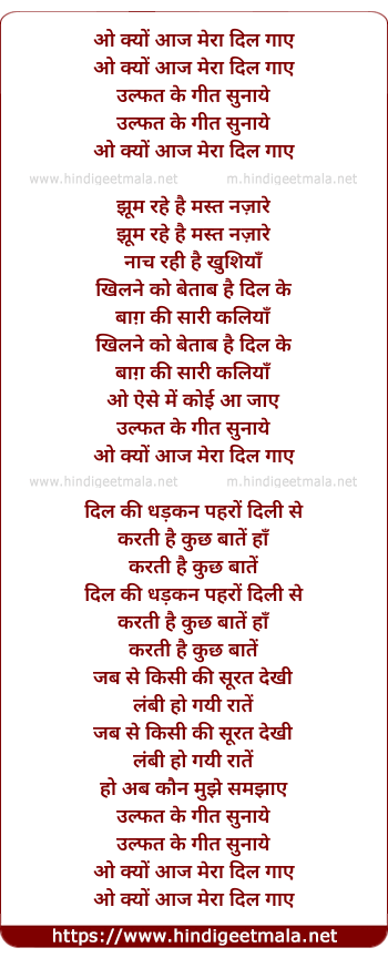 Lyrics of O Kyun Aaj Mera Dil Gaaye - ओ क्यों आज मेरा दिल गाए