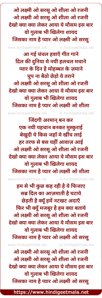Lyrics of O Laxmi O Sarsu, O Sheela, O Rajni Dekho Kya Kya Lekar Aaya - ओ लक्ष्मी ओ सरसू, ओ शीला, ओ रजनी देखो क्या क्या लेकर आया