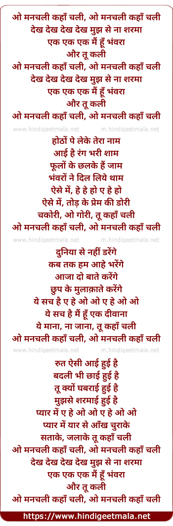 Lyrics of O Manachali Kahaan Chali Dekh Mujh Se Na Sharmaa - ओ मनचली कहाँ चली देख मुझ से ना शरमा