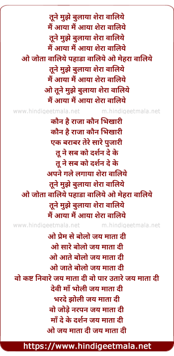 Lyrics of Tune Mujhe Bulaya Shera Waliye - तूने मुझे बुलाया शेरा वालिये