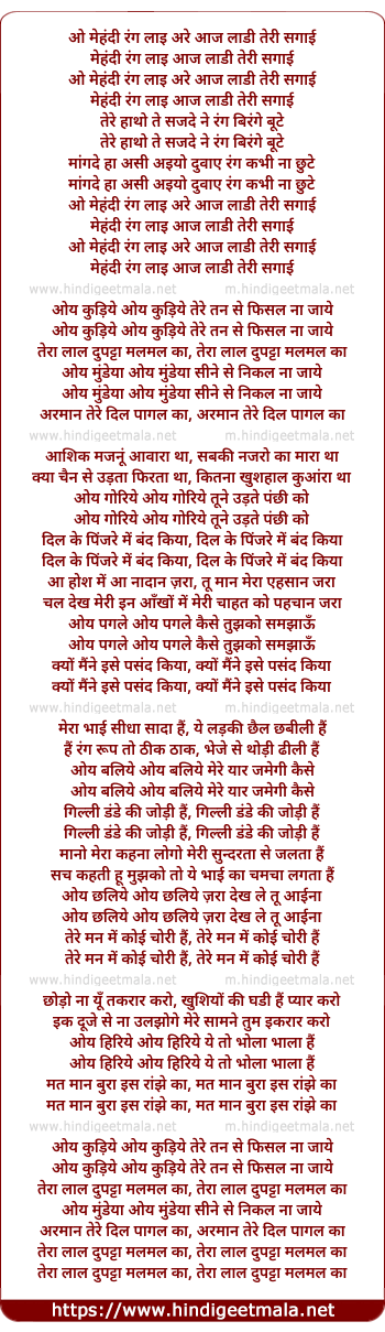 Lyrics of O Mehandi Rang Laai Are Aaj Laadi Teri Sagaai - ओ मेहंदी रंग लाई अरे आज लाडी तेरी सगाई