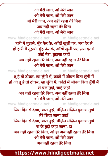 Lyrics of O Meree Jan, Abb Nahee Rahana Tere Bina - ओ मेरी जान, अब नहीं रहना तेरे बिना