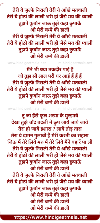 Lyrics of O Meri Champe Ki Daali - तेरी ये ज़ुल्फे निराली तेरी ये आँखे मतवाली