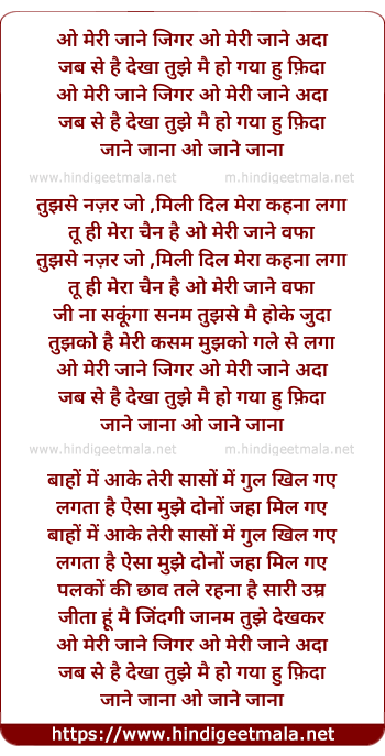 Lyrics of O Meri Jaane Jigar - ओ मेरी जाने जिगर
