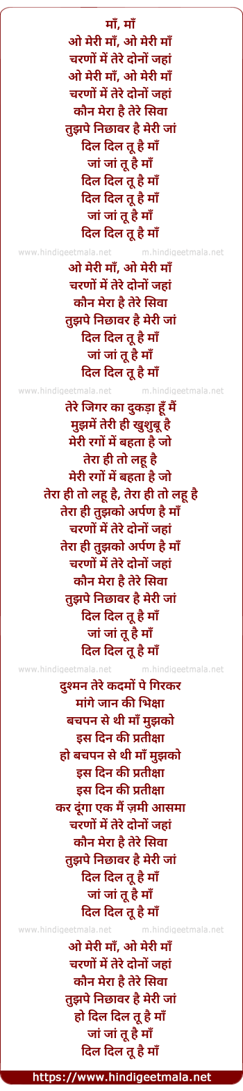 Lyrics of O Meri Maa - ओ मेरी माँ