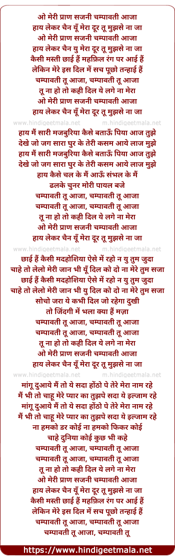 Lyrics of O Meri Pran Sajni Champavati Aaja - ओ मेरी प्राण सजनी चम्पावती आजा