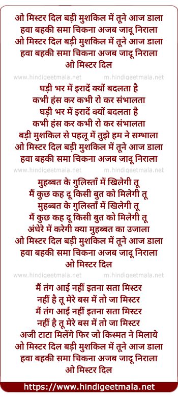 Lyrics of O Mistar Dil Badi Mushakil Men Tune Aaj Daalaa - ओ मिस्टर दिल बड़ी मुशकिल में तूने आज डाला