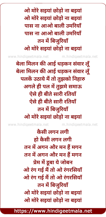 Lyrics of O More Saiyaan - ओ मोरे सइयां छोड़ो ना बइयां