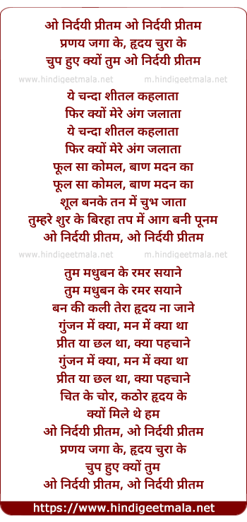 Lyrics of O Nirdai Pritam - ओ निर्दयी प्रीतम