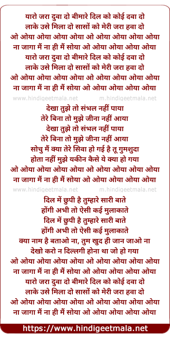 Lyrics of O Oya Oya, Yaro Jara Duwa Do Bimaare Dil Ko Koyi Dawa Do - ओ ओया ओया, यारो जरा दुवा दो बीमारे दिल को कोई दवा दो