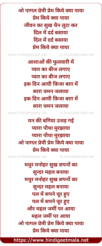 Lyrics of O Pagal Premi - ओ पागल प्रेमी