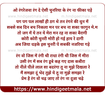 Lyrics of O Rangarejavaa Rang De Aisi Chunariyaa - ओ रंगरेजवा रंग दे ऐसी चुनरिया के रंग ना फीका पड़े