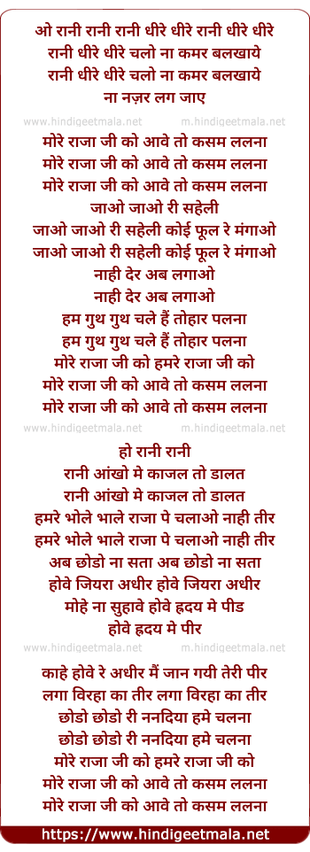 Lyrics of O Rani Rani Dhire Dhire Chalo Na - ओ रानी रानी रानी धीरे धीरे रानी धीरे धीरे