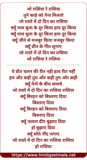 Lyrics of O Rasiya Tune Kahe Ko Nain Milaye - ओ रासिया रे रासिया