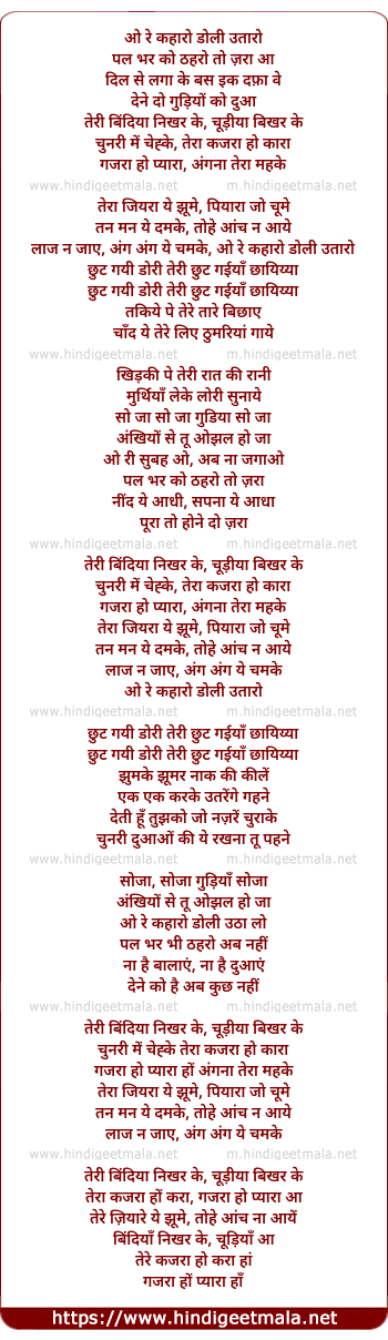 Lyrics of O Re Kaharon Doli Utaaro - ओ रे कहारों डोली उतारों