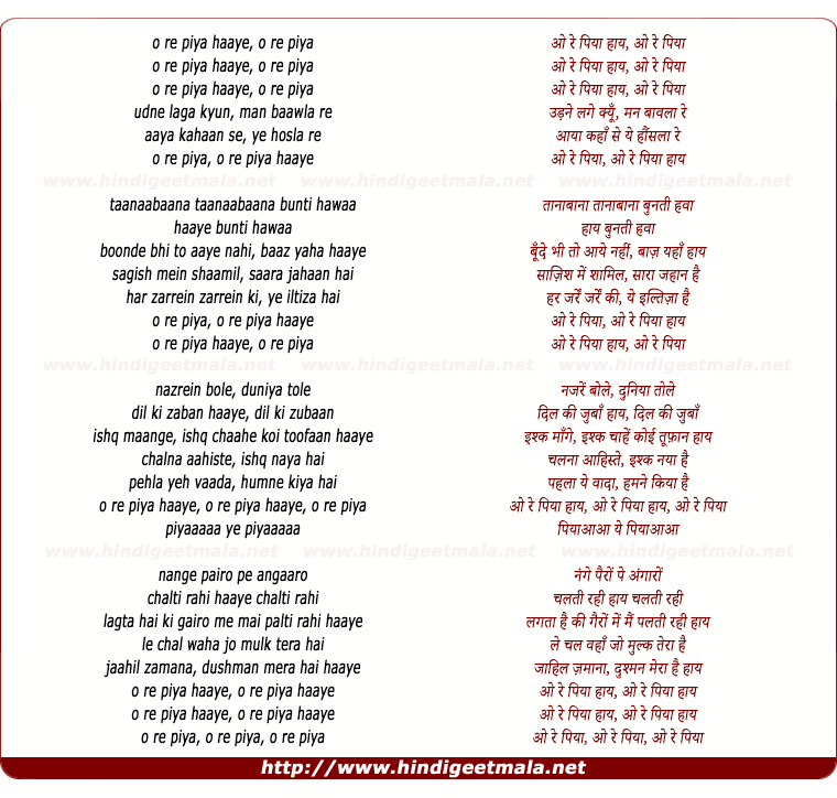 Lyrics of O Re Piya - ओ रे पिया