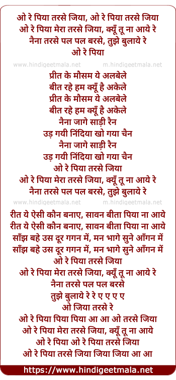 Lyrics of O Re Piya Tarse Jiya - ओ रे पिया तरसे जिया, ओ रे पिया तरसे जिया