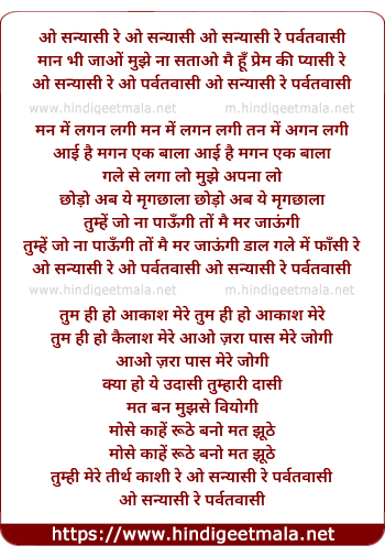 Lyrics of O Sanyasi Re Parvatwasi Maan Bhi Jaao Mujhe No Sataao - ओ सन्यासी रे पर्वतवासी मान भी जाओं मुझे ना सताओ