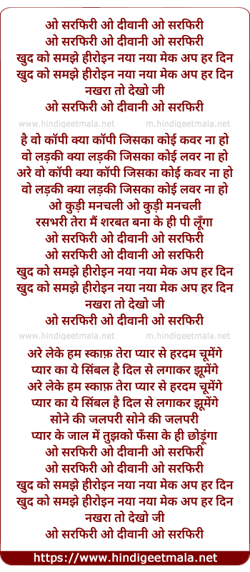 Lyrics of O Saraphiri Ho Divaani, Khud Ko Samjhe Heroine - ओ सरफिरी हो दीवानी, खुद को समझे हीरोइन