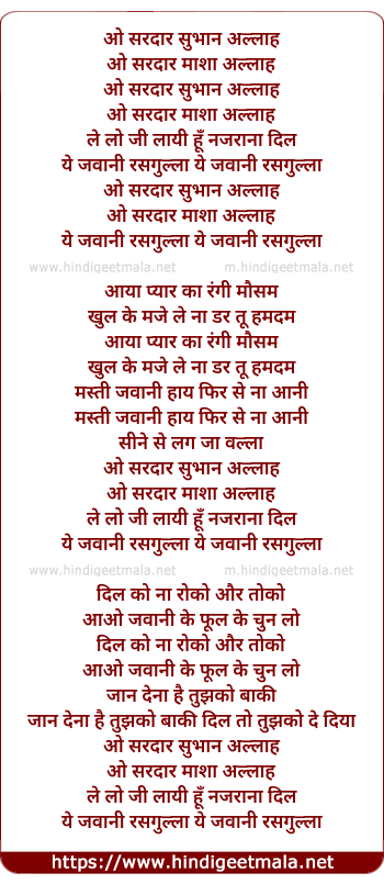 Lyrics of O Sardar Subhan Allaah - ओ सरदार सुभान अल्लाह
