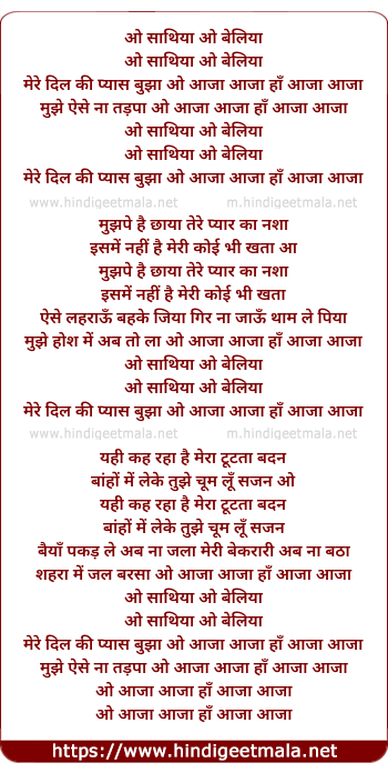 Lyrics of O Sathiya O Beliya, Mere Dil Ki Pyas Bujha - ओ साथिया ओ बेलिया, मेरे दिल की प्यास बुझा