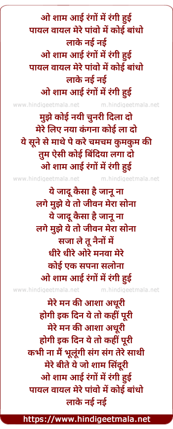 Lyrics of O Sham Aayee Rango Me Rangee Huyee - ओ शाम आई रंगों में रंगी हुई