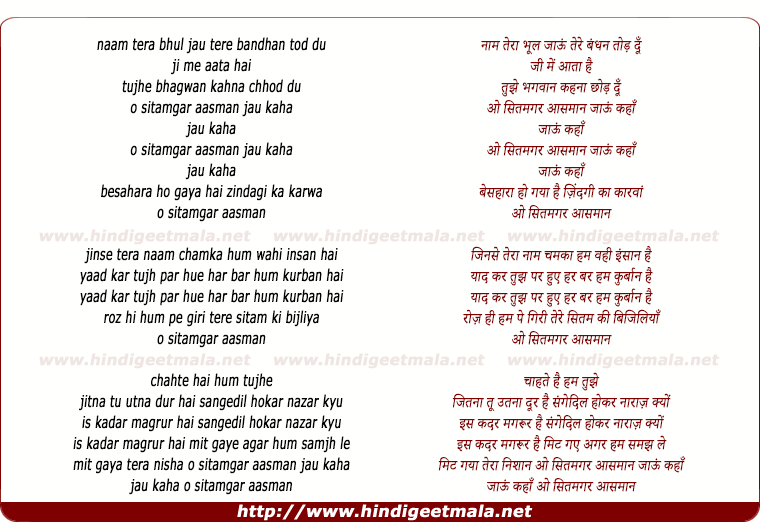 Lyrics of O Sitamgar Aasman Jau Kaha - ओ सितमगर आसमान जाऊं कहाँ