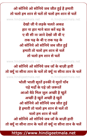 Lyrics of O Soniye O Soniye Jab Jeet Hui Hamari - ओ सोनिये ओ सोनिये जब जीत हुई है हमारी