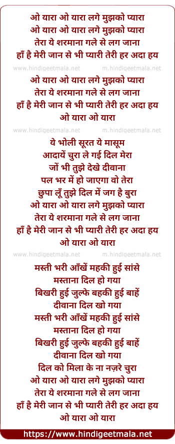 Lyrics of O Yaara O Yaara - ओ यारा ओ यारा