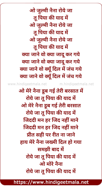 Lyrics of O Zulmi Naina Roye Ja Tu - ओ जुल्मी नैना रोये जा तू
