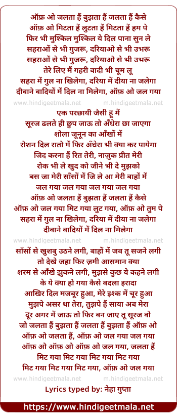 Lyrics of Of O Jalataa Hai Bujahataa Hai Jalataa Hai - ऑफ़ ओ जलता हैं बुझता हैं जलता हैं