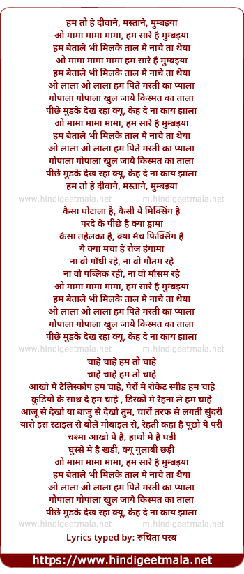 Lyrics of Oh Mama Mama Mama, Ham Saare Hain Mumbaiya - ओ मामा मामा मामा, हम सारे है मुम्बईया