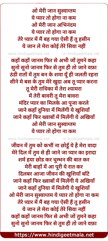 o meri jaan suswagatam ye pyar to hoga na kam