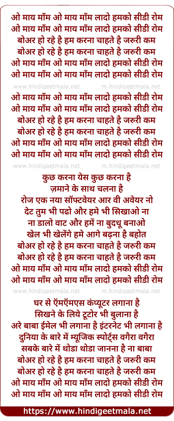 Lyrics of Oh My Mom Lado Humko Cd Rom - ओ माय माँम लादो हमको सीडी रोम