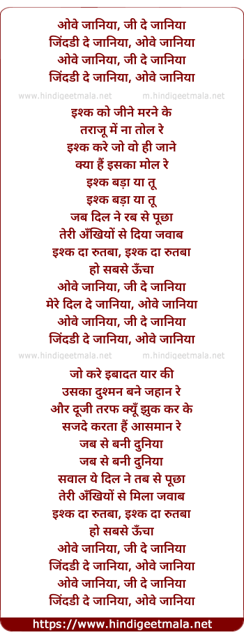 Lyrics of Ove Janiya (Reprise) - ओवे जानिया, जी दे जानिया