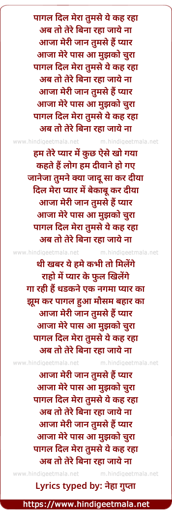 Lyrics of Pagal Dil Mera Tumase Ye Kah Raha - पागल दिल मेरा तुमसे ये कह रहा