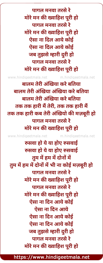 Lyrics of Paagal Manava Tarase Re - पागल मनवा तरसे रे