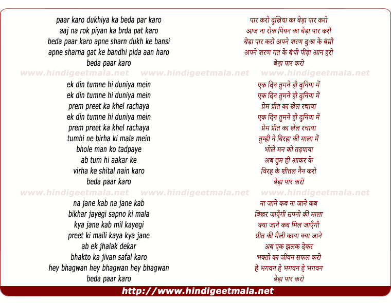 Lyrics of Paar Karo Dukhiya Ka Beda Paar Karo - पार करो दुखिया का बेड़ा पार करो