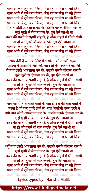 Lyrics of Paas Aa Ke Ye Tune Kya Kiya - पास आ के ये तूने क्या किया