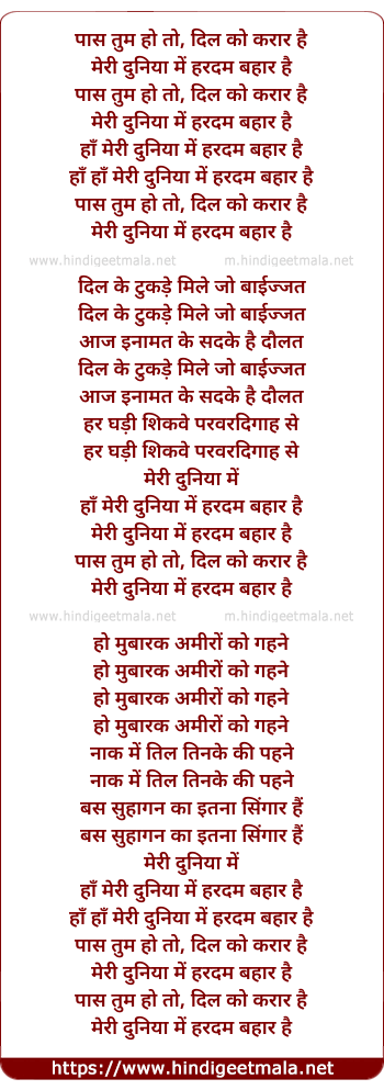 Lyrics of Paas Tum Ho To Dil Ko Karar Hai - पास तुम हो तो, दिल को करार है