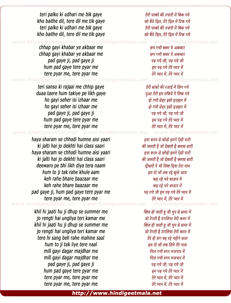 Lyrics of Pad Gaye Tere Pyaar Me - पड़ गये तेरे प्यार में