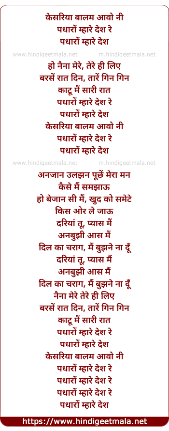 Lyrics of Padharo Mhare Des - केसरिया बालम आवो नी