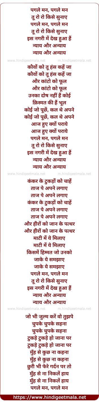 Lyrics of Pagle Man Tu Ro Ro Kise Sunaye - पगले मन, पगले मन