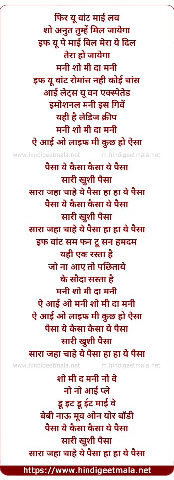 Poetic Translation - Lyrics of Paisa Paisa (Extended Club Mix) - फिर यू वांट माई लव