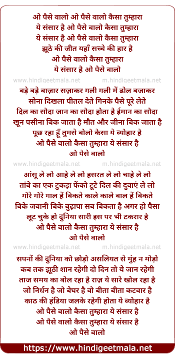 Lyrics of Paise Walo Kaisa Tumhara Ye Sansar Hai - पैसे वालो कैसा तुम्हारा ये संसार है