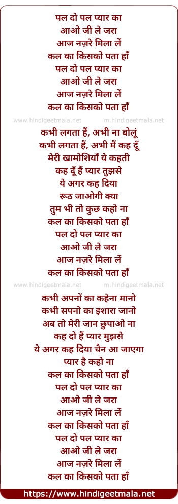 Lyrics of Pal Do Pal Pyar Ka - पल दो पल प्यार का