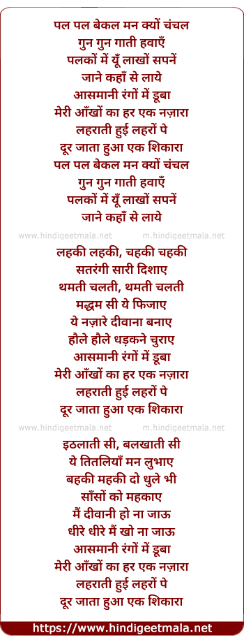 Lyrics of Pal Pal Bekal - पल पल बेकल मन क्यों चंचल