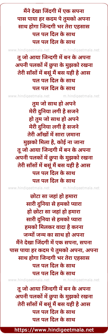 Lyrics of Pal Pal Dil Ke Saath - पल पल दिल के साथ